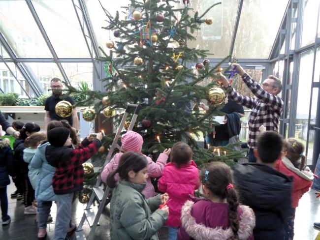 Während die kleinen Künstler*innen ihre gebastelten Weihnachtsdekorationen an den unteren Zweigen des Weihnachtsbaums selbst anbringen konnten, halfen bei den oberen Zweigen der Abteilungsleiter Berufsfachschulen, Berufseinstiegsschule, Fachoberschulen Daniel Teyke und der Schulsozialarbeiter Felix Alves von der Friedrich-List-Schule. Sie mussten dafür teilweise sogar auf die Leiter steigen, weil der Baum so groß ist. Zur Stärkung erhielten die Kinder im Anschluss von der Schulsekretärin Catrin Eschemann Kakao und Kekse.