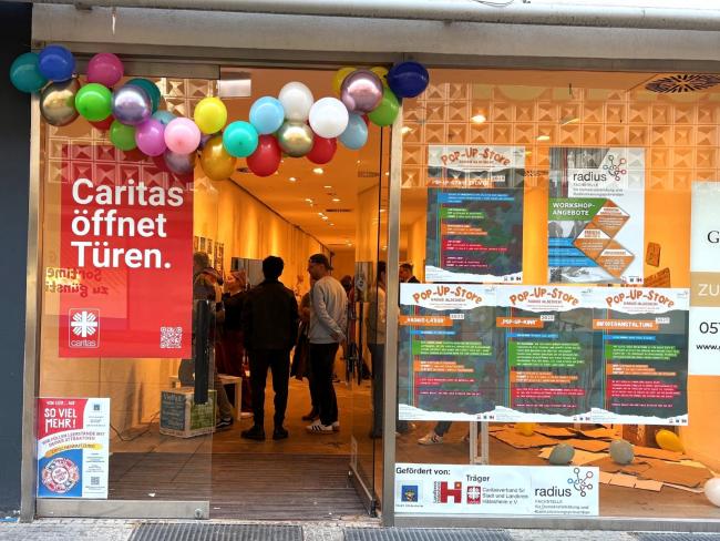 Bildunterschrift: Mit dem Pop-Up-Store in der Hildesheimer Fußgängerzone bietet radius jungen Menschen eine wichtige Anlaufstelle für Fragen rund um die Themen Demokratiebildung und Radikalisierungsprävention. Foto: Caritasverband für Stadt und Landkreis Hildesheim e.V.
