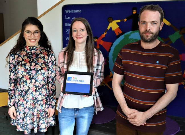 Bildunterschrift: Ebru Akpinar, Einrichtungsleiterin Lisa Kundt und Julian Hölscher (v.li.) aus dem Caritas Familienzentrum St. Bernward freuen sich über die Einführung der Kita-Info-App. Quelle: Caritasverband für Stadt und Landkreis Hildesheim e.V.