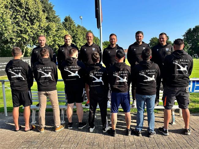Bildunterschrift: Die Ü32-Herrenmannschaft des FSV Algermissen präsentiert gemeinsam mit der Fachkraft für Glücksspielsucht bei der Caritas Cathrin Rack die neuen Pullover mit der Botschaft „Sportwetten“ auf dem Rücken.